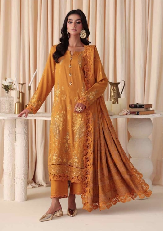 A stunning mustard embroidered leather peach outfit paired with an elegant jacquard shawl. Dastaan By Riaz Arts | DS-02 is perfect for warm, graceful winter styling. Ideal for UK casual and office wear.