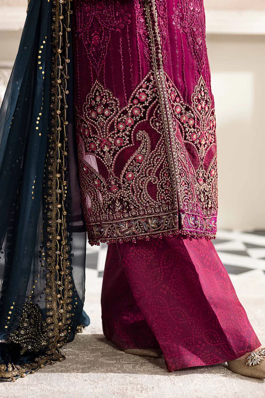 An unstitched Maria B chiffon suit in rich plum with hand-embellished velvet details, intricate embroidery, and a mukaish chiffon dupatta, perfect for weddings and festive soirées.