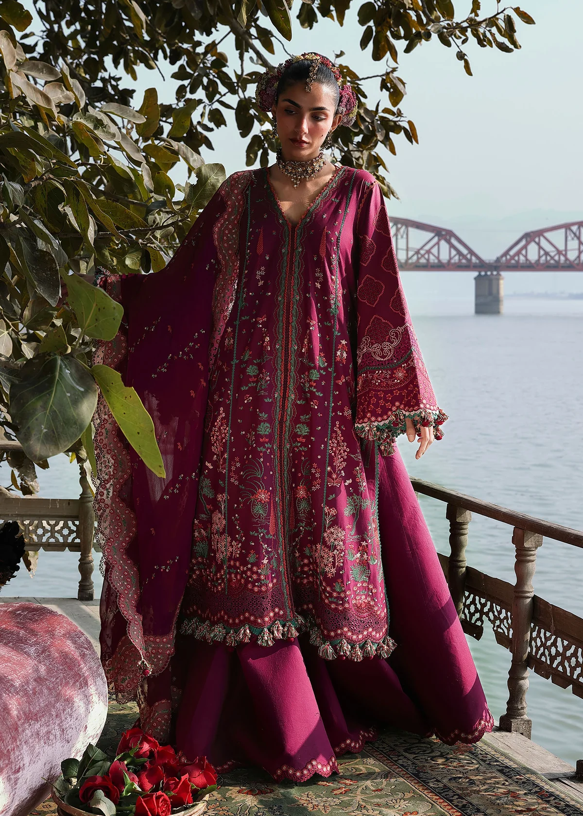 Hussain Rehar Unstitched Lawn Eid Edit-Anjas in rich plum features embroidered lawn front and back panels with chiffon dupatta and organza borders.