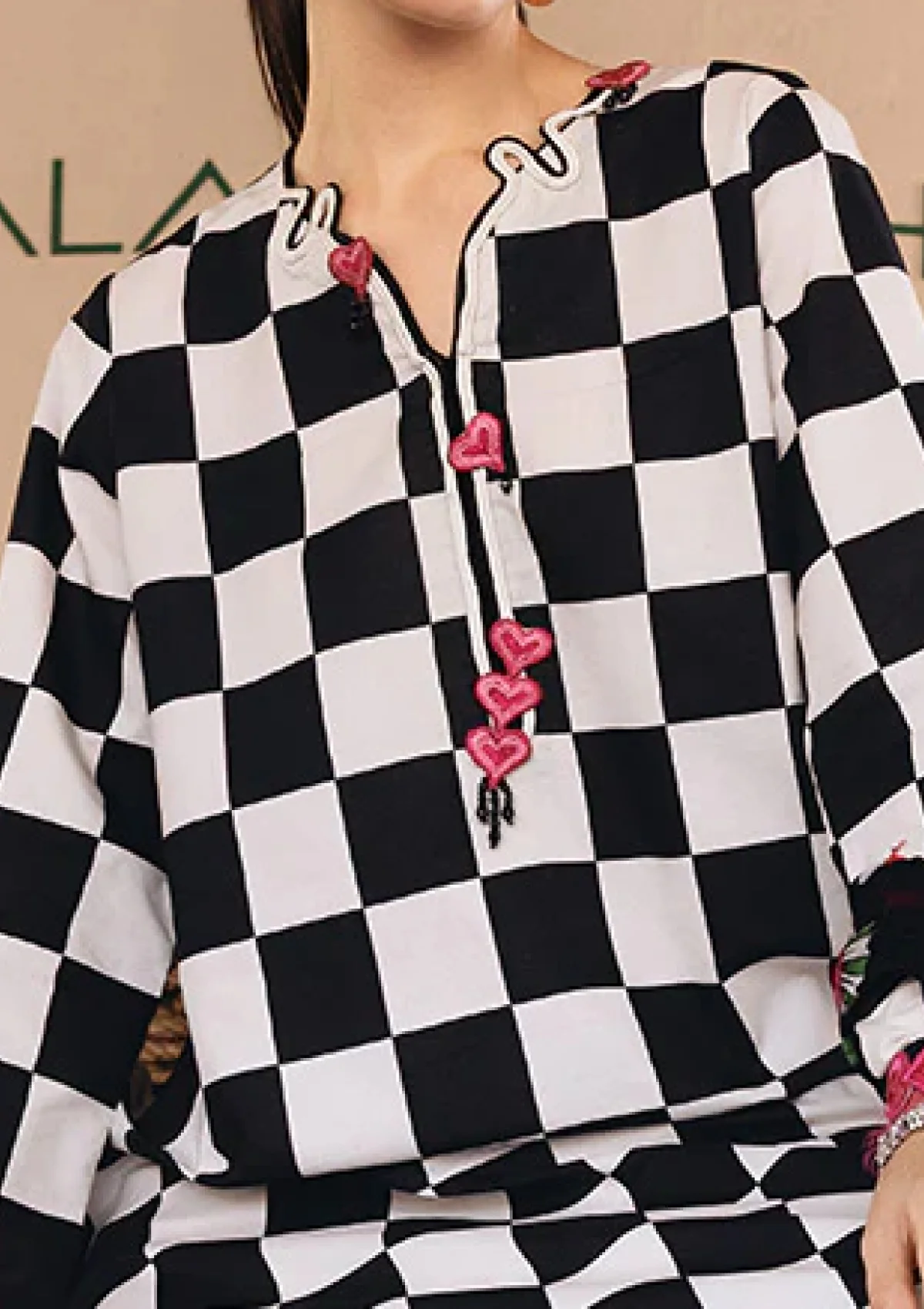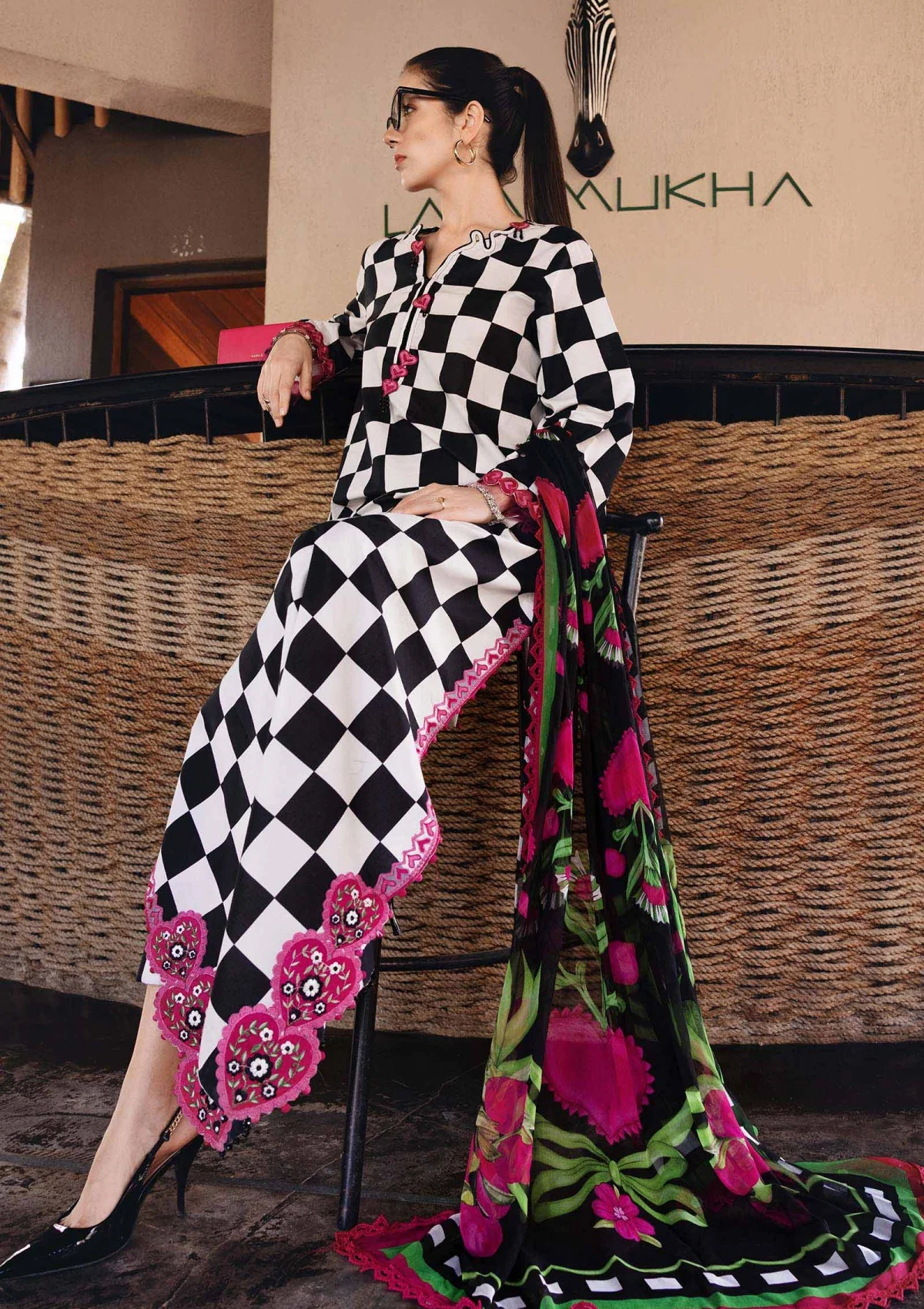 Maria B M.Prints Spring Summer Lawn ’26-6B is an off-white & black 3-piece unstitched lawn suit featuring an embroidered printed shirt with Ghera R+L patches, printed cambric trouser, and printed chiffon dupatta.