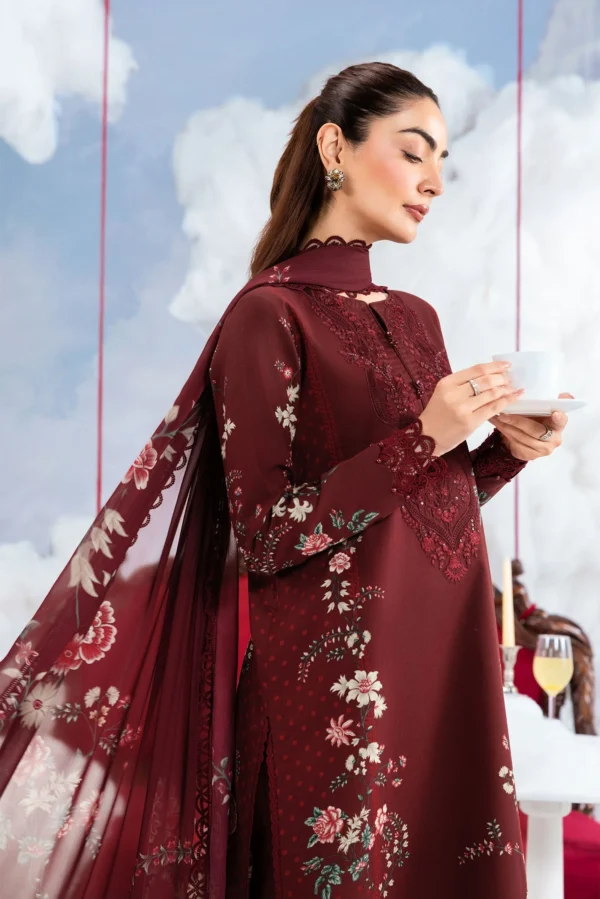 MBasics 3 Pc Unstitched Embroidered Lawn Suit-MB-26-7A features maroon printed lawn shirt, chiffon dupatta, embroidered neck patch, and cambric trouser.
