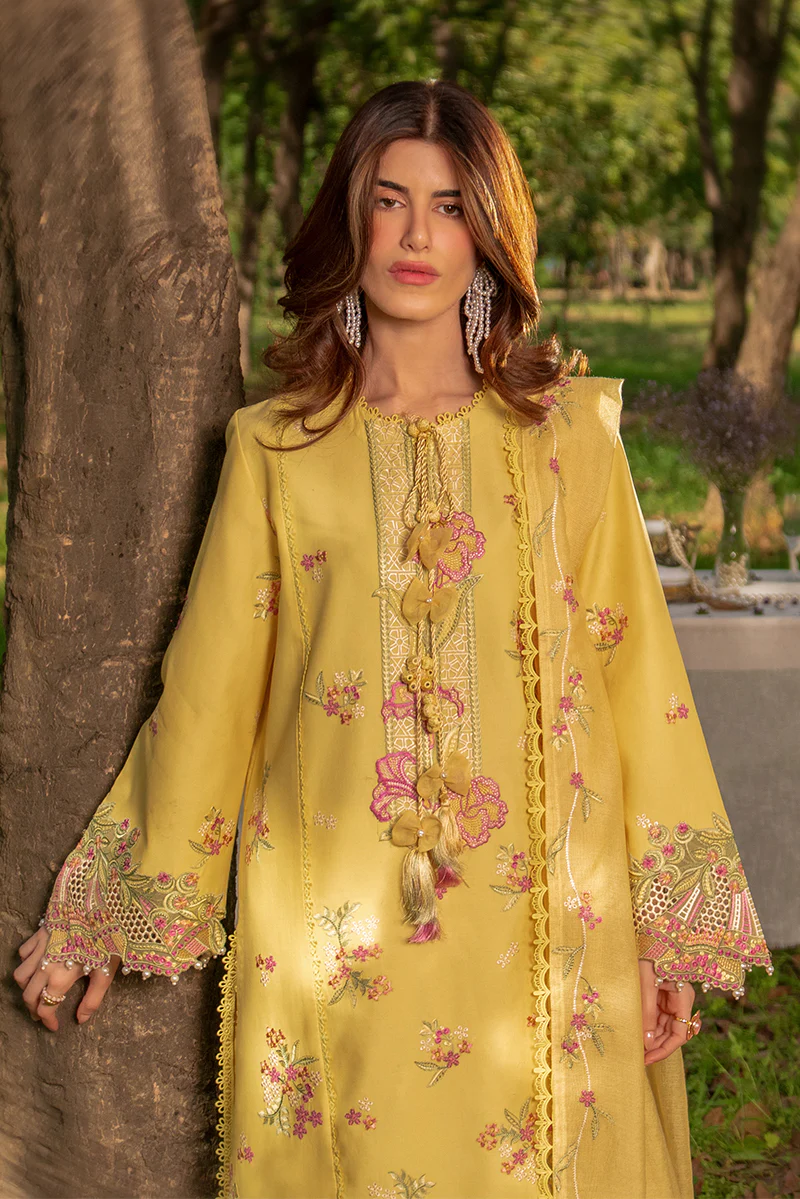 Shop Rang Rasiya Unstitched Eid Outfit 26′-MYSHA, a luxury 3-piece embroidered lawn suit perfect for Eid and summer wear in the UK.