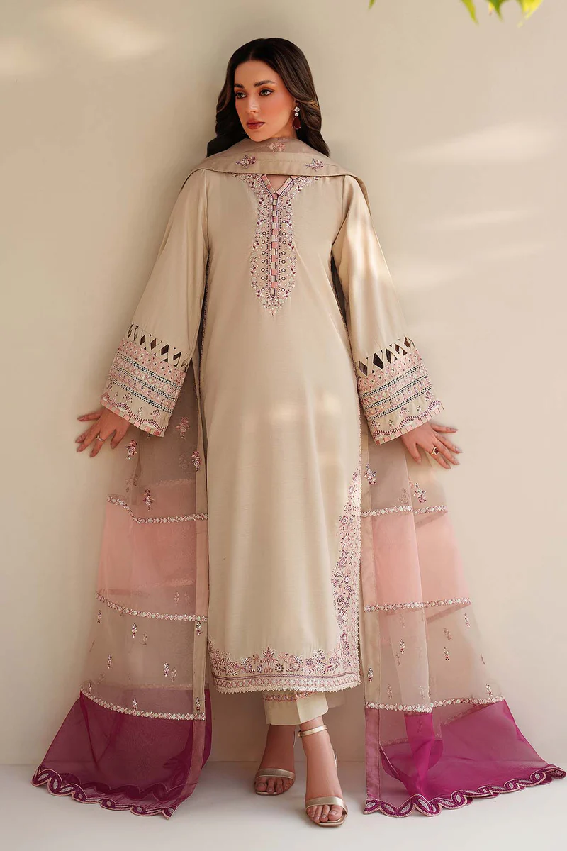 The Tabeer By Zarif 3-Piece Unstitched Embroidered Silk Dress | 06 Raag features luxurious sequins embroidered raw silk paired with a striking 3-tone organza dupatta for a refined winter look. Ideal for festive occasions and elegant party wear in the UK.