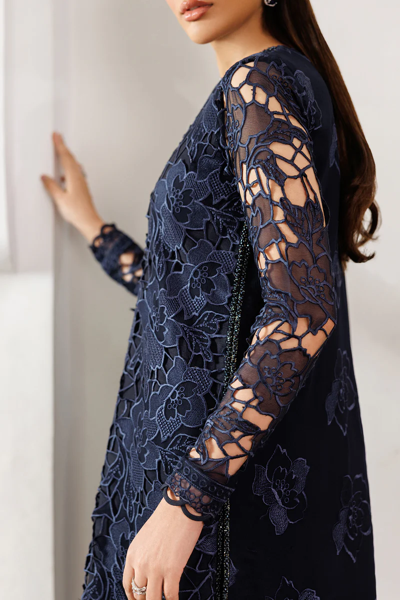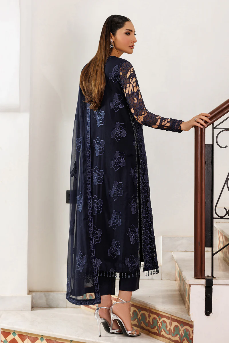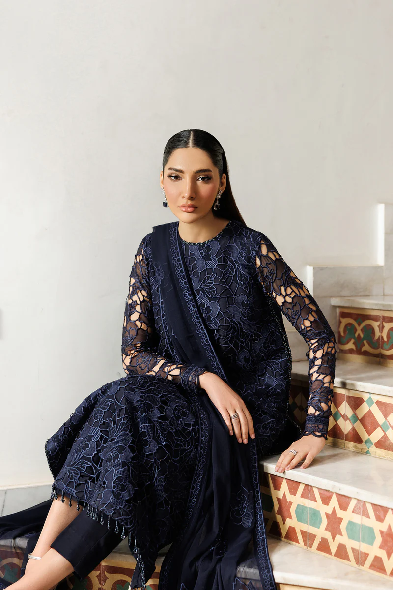 Shop Zarif Unstitched Chiffon Suit 26’-SARAYA-02 navy blue from Nourah By Zarif. Luxury embroidered chiffon suit with fast UK delivery.