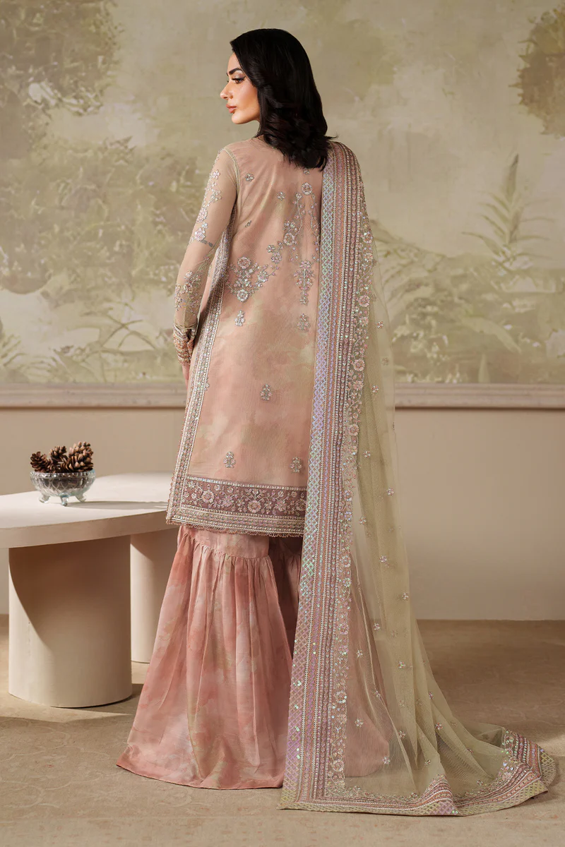 Discover elegance with the Zarif Zaneera Formals ZRF-ZPE-04 SERIYAH. This 3-piece peach-colored sequin-embroidered net salwar kameez is perfect for formal occasions and parties. Designed for timeless beauty, it offers a blend of intricate embroidery and delicate prints.